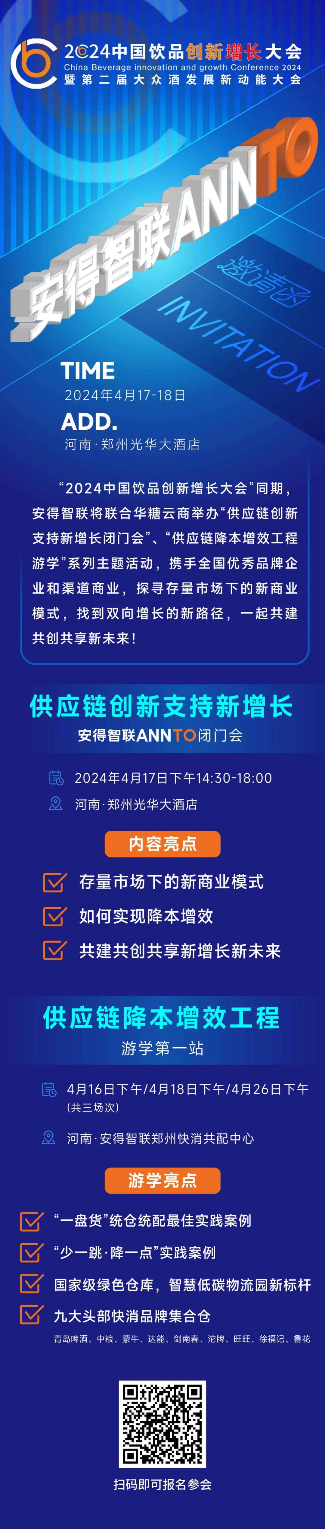 2024年4月17-19日,第二届大众酒发展新动能大会暨第七届中国饮品大会将在河南郑州举行。期间,安得智联将联合华糖云商举办“供应链创新支持新增长闭门会”“供应链降本增效工程游学”系列主题活动,参观青岛啤酒、中粮、蒙牛、达能、剑南春、沱牌、旺旺、徐福记、鲁花等九大头部快消品牌集合仓,携手全国优秀品牌企业和渠道商业,探寻存量市场下的新商业模式,找到双向增长的新路径,一起共建共创共享新未来!
