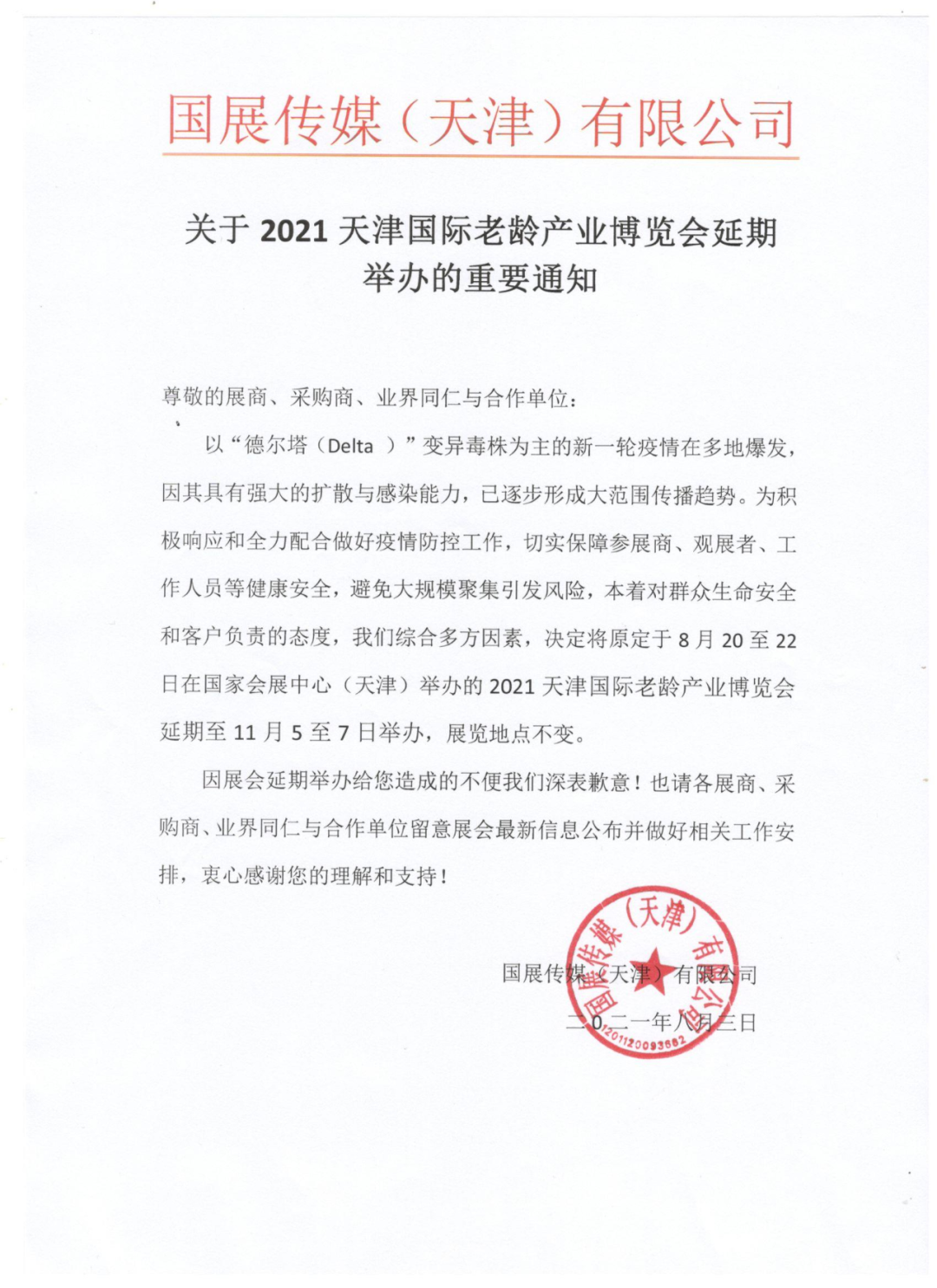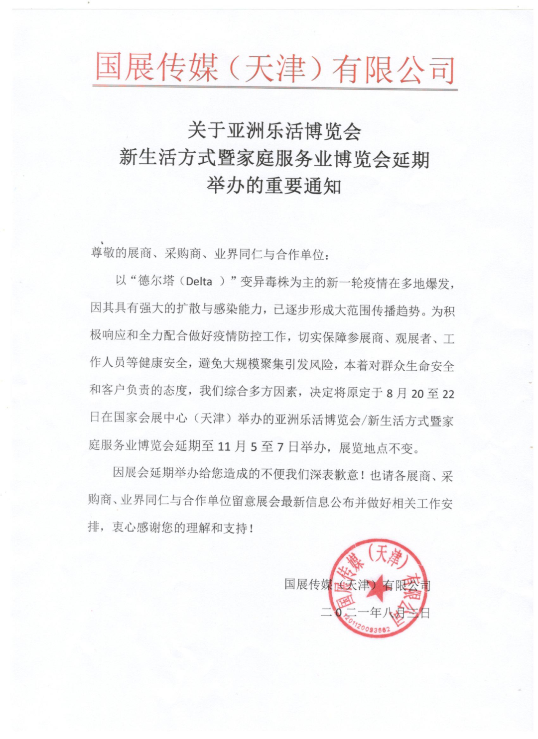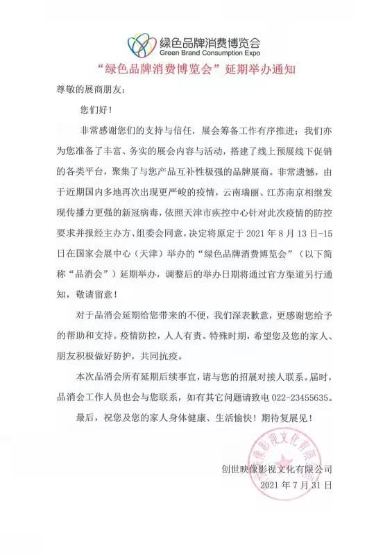 鉴于当前国内疫情发展态势,按天津市疫情防控办公室要求,为确保各位参展商、观众,受邀嘉宾、业界朋友们的健康和生命安全,