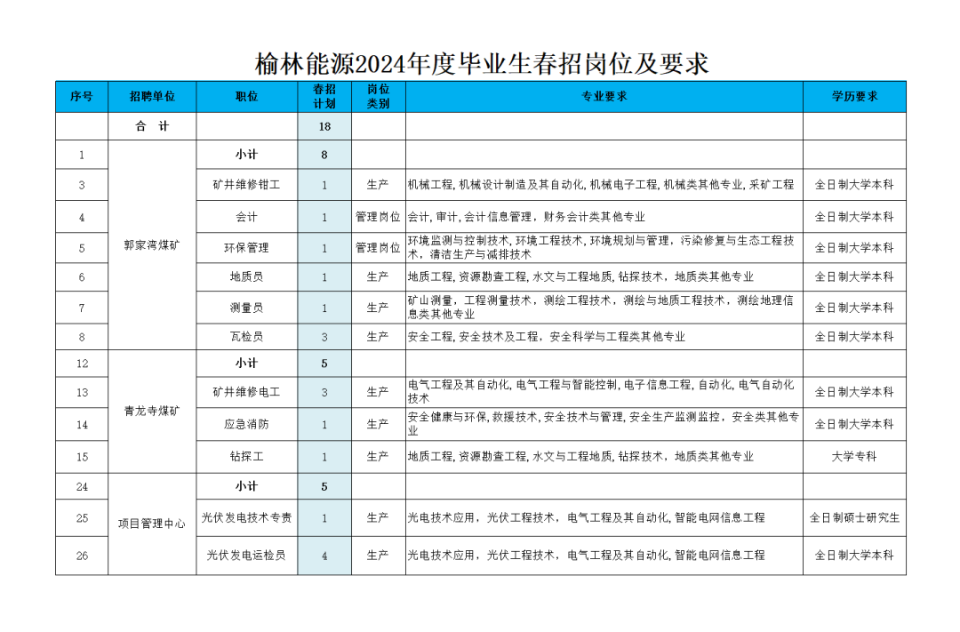 国能榆林能源有限责任公司成立于2008年4月,初始注册资本10亿元,总部设在陕西省榆林市高新技术产业园区,是一家以煤炭生产、加工、销售等为主要业务的综合能源企业。公司以府谷县袁家梁、郭家湾、青龙寺三块井田(总面积169.5km2,探明储量14.4亿吨)为基地,建设有1200万吨/年的郭家湾和青龙寺两个煤矿,配套建设有1500万吨/年选煤厂和铁路专用线。同时做好煤炭经销工作。全国普通高等院校统招统分应届毕业生;回国(境)后初次就业且具有教育部留学服务中心派遣资格的国(境)外院校留学生;两年择业期内未就业毕业生。国内院校应届毕业生应当于2024年7月31日前毕业并取得相应的学历学位证书;国(境)外院校留学生应当于2024年8月31日前取得教育部留学服务中心学历学位认证;两年择业期内未就业学生毕业时间应当为2022年1月1日以后。本科生一般应当在1998年7月1日(含)以后出生,硕士研究生一般应当在1995年7月1日(含)以后出生,博士研究生一般应当在1990年7月1日(含)以后出生。4月12日— 4月30日(上午12:00截止报名)登陆国家能源集团人力资源招聘网站(http://zhaopin.chnenergy.com.cn)校园招聘栏“统招”入口查询岗位信息。每名毕业生仅可以应聘1个岗位,请慎重选择。如需更换岗位,须取消前次应聘,再发送新的求职申请。统一线下笔试(博士研究生免笔试)。根据报名时个人选择“期望考试城市”就近安排考点,请在报名时务必选择期望考试城市,海外考生可以参加线上笔试。对拟录用人员进行公示,公示期无异议的,用人单位按照规定办理入职。报到时应当提供毕业证、学位证、户口迁移证、人事档案等相关材料。1.应聘人员务必准确、完整填写简历信息,并对所提供信息真实性负责。如发现虚假信息,取消毕业生应聘资格。2.国家能源集团不组织应聘前培训活动,也不以任何形式向应聘人员收取报名、培训等费用,请应聘人员提高警惕,谨防受骗。来源:国能榆林能源微信平台