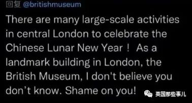“伦敦市中心到处是庆祝中国农历新年的大规模活动!作为伦敦地标,大英博物馆,我不相信你不知道?为你感到羞耻!”