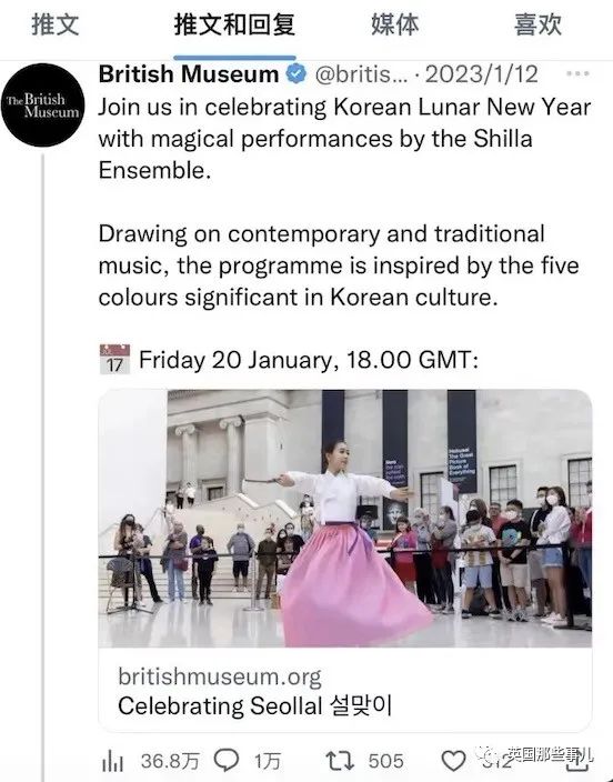 而这一次的事件,正是韩国文化体育观光部定于1月20日在大英博物馆内举办了农历新年庆祝活动,包括韩国传统音乐和舞蹈表演,还有韩国馆馆长发表演讲。大英博物馆官推发的那条庆祝“韩国农历新年”的推文,正是为了大力配合金主,韩国文化体育观光部的庆祝活动而发的。