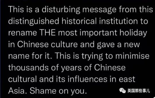 “这是一家知名历史机构传递出来的恶心消息。它竟然重新命名了中国最重要的节日。这是试图把中国几千年来对东亚文化的影响抹杀掉。为你感到羞耻!”