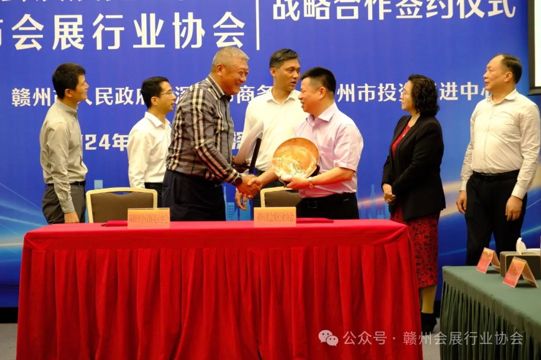 深圳市会议展览业协会会长蒋承文与赣州市会展行业协会会长方平互赠签约纪念礼品
