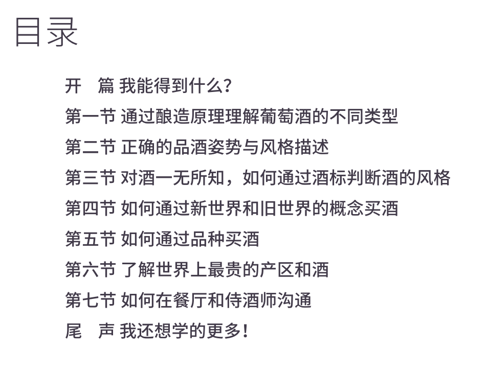 教你如何在没有打开一瓶酒的情况下,利用酒标得到尽可能多的线索,来推断这款酒的真实面貌和值不值得买。除此之外,我还会把我创业八年的行业经验倾囊相授,告诉你选购各种渠道、各类酒款的坑。