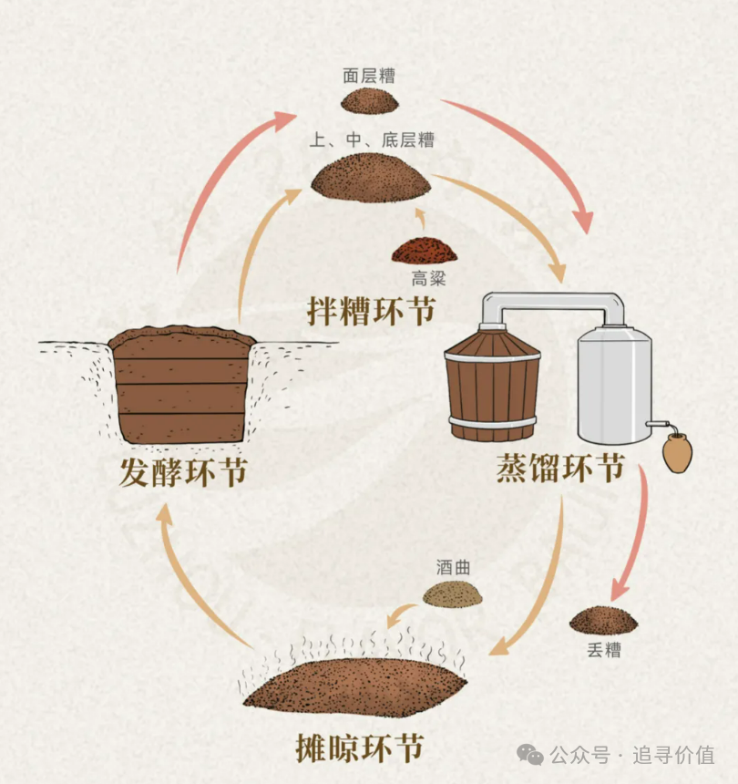 举一个我自己的例子。根据之前的研究(买入五粮液),五粮液的增长逻辑是“提价+名酒率提升”,因此推算名酒率成为研究五粮液的一项重要工作。名酒率是指在公司生产的全部白酒中,符合特定品质标准、能够被归类为高端或优质产品(八代普五、经典五粮液、五粮液1618)的那部分酒的比例。因此我想当然地以为当年名酒率=五粮液高端产品产量/全部产品产量,得出来2022年五粮液名酒率=3.38/12.93=26.14%。在评判、区分酒的品质时讲究的是“量质分级摘酒”,具体流程是:上甑蒸馏过程中,酒师要根据蒸馏出的酒花(指基酒的酒花)大小、滞留时间,边摘边品尝,准确分级,掐头去尾,只取中断精华,最后摘取出各段次不同品质的酒液,如优质酒、一级酒、二级酒并分级储存。也就是说,名酒的摘取是在蒸馏环节,而不是在勾兑结束后再评酒。所以我们不应看勾兑后的商品酒中名酒的比例,而是看产出的基酒中名酒的比例,故应有:当年名酒率=五粮液高端基酒产量/全部基酒产量。从这个例子可见理解工艺对于白酒股投资的重要意义。在茅台的例子中,工艺对于未来业绩预测的重要性更是不言而喻,可以说不懂茅台工艺就无法理解茅台的业绩增长逻辑。问题又来了,五粮液基酒产量没有公布,我们又如何推测呢?答案放在后文公布,我们先来说白酒酿造的一般工艺。中国传统白酒的主要工艺是所谓的“纯粮大曲固态发酵”,主要流程包括制曲、蒸料、发酵、蒸馏、陈化和勾兑成酒,核心是制曲、发酵和蒸馏三个环节。曲是白酒的发酵剂,正所谓“曲是酒之骨”,最早的酒曲就是发霉或发芽的谷物。大曲一般以大麦、小麦、豌豆为原料(小曲以米粉,米糠为原料),大典曲块的个头比小曲要大很多,由于原料更丰富,大典的糖化能力和产香能力更胜一筹。制曲的基本流程是原料经粉碎后加水和曲母制成曲坯,在室内保温培养,让微生物生长繁殖,再经风干、储存,即成大曲。制曲的原理是让曲霉、根霉、酵母菌等微生物自然繁殖,微生物生长繁殖的过程中会分泌各种糖化酶和酒化酶。发酵的基本流程是将新蒸好的酒粮与粉碎的酒曲搅拌混合后,入窖池发酵。由于窖池和酒醅中几乎没有可自由流动的水,微生物在固态基质上进行发酵,这种方法被称作“固态发酵”。中国白酒的发酵方法是糖化与酒化同时进行,边糖化、边酒化,发酵过程的一些环节是开放的,酒醅与环境中的微生物接触,因此也被称作“双边开放式发酵工艺”。发酵的原理是先糖化再酒化。所谓糖化就是把粮食中的淀粉转化为单糖的过程,起转化作用的微生物主要是霉菌;所谓酒化就是将已经形成的糖进一步分解,转化为乙醇的过程,这一过程中起作用的微生物主要是各类酵母菌。在酒化的过程中,还会代谢出别的酸类、醇类和酯类,它们是白酒主要的生香呈味物质。“无酯不呈香”,酒的香与味,源于酒中的酯类物质;而“无酸不成酯”,没有酸类物质,就无法生成酯类物质,而酸来自细菌的代谢活动。中国传统的黄酒就是发酵酒,发酵酒的酒精度很低,白酒还需要在发酵之后增加一个蒸馏提纯的过程。蒸馏的基本流程在李时珍的《本草纲目》中即有记载,“烧酒非古法也,自元时始创,其法用浓酒和糟,入甑蒸令气上,用器承取滴露,凡酸坏之酒,皆可蒸烧”,然后酒师对蒸馏出的酒量质摘酒,随着酒液流出,酒精度从最高点逐渐下降,“过花摘酒”直至酒尾露面。蒸馏的原理是由于乙醇的的沸点比水低,加热过程中乙醇比水先汽化再冷凝,从而提高酒的度数。从酒甑中蒸馏出的基酒度数一般在70度到85度之间,需要靠勾兑来统一口味、降低度数、协调香味,这个工艺被称之为勾兑或勾调。最后,把白酒放置一段时间后饮用口感更佳,这个工艺叫陈化老熟。说浓香工艺绕不开泸州老窖,浓香型又被称作泸香型。1957年开始的“泸州老窖试点”总结了泸香工艺并出版了教科书《泸州老窖大曲酒》,20世纪60和70年代老窖开办数十期培训班,为全国各省的酒厂培养了数千名酿酒技术骨干。