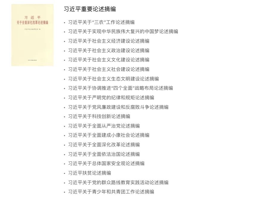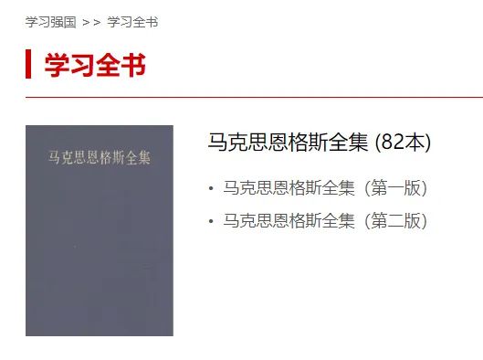 今天给大家推荐“学习强国”的“学习全书”板块,这个学习书库包含了马克思、恩格斯、列宁、毛泽东、邓小平、江泽民、胡锦涛、习近平的著作或相关学习辅导材料,目前书库里已有350多本,堪称政治学习的最权威书库。点开每套书封面图,即可登录“学习强国”学习平台阅读这些经典图书。