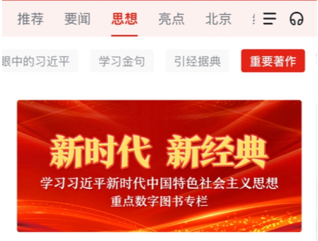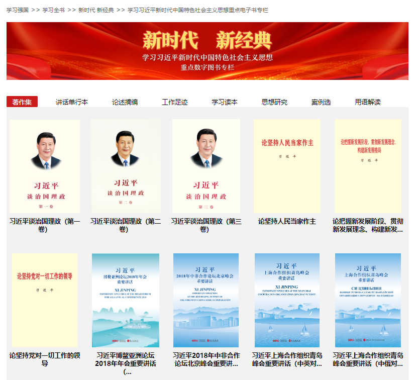 如果想要学习习近平新时代中国特色社会主义思想,还可以直接进入“新时代 新经典”栏目,这里收录了著作集,单行本,论述摘编,读本类,思想研究、学习体会,语言典故,生活经历等多种数字图书。