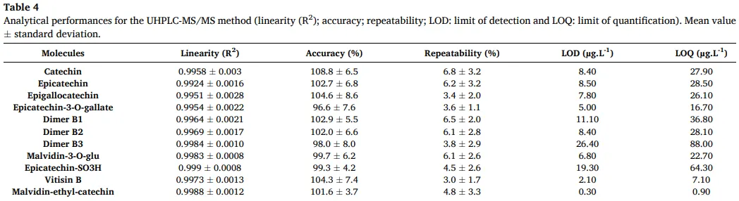 在验证过程中评估的第一个参数是基质效应,衡量方法的特异性。表儿茶素-3-O-没食子酸酯、原花青素二聚体B1、B2和表儿茶素-SO3H 没有表现出基质效应,其余化合物需要在红葡萄酒基质中进行校准。