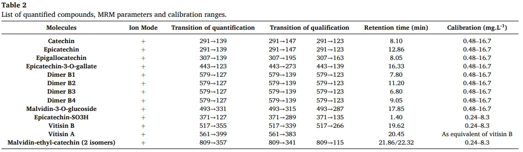 •开发UHPLC-QqQ-MS方法,对西拉红葡萄酒陈酿过程中选定的多酚进行定量分析。
