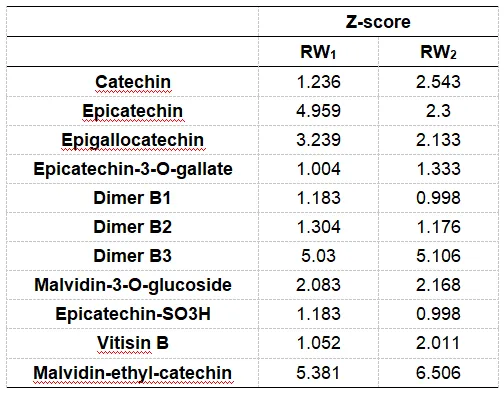 表S4. 矩阵效应(Z-score)系数计算了两种西拉红酒与模型酒的比较