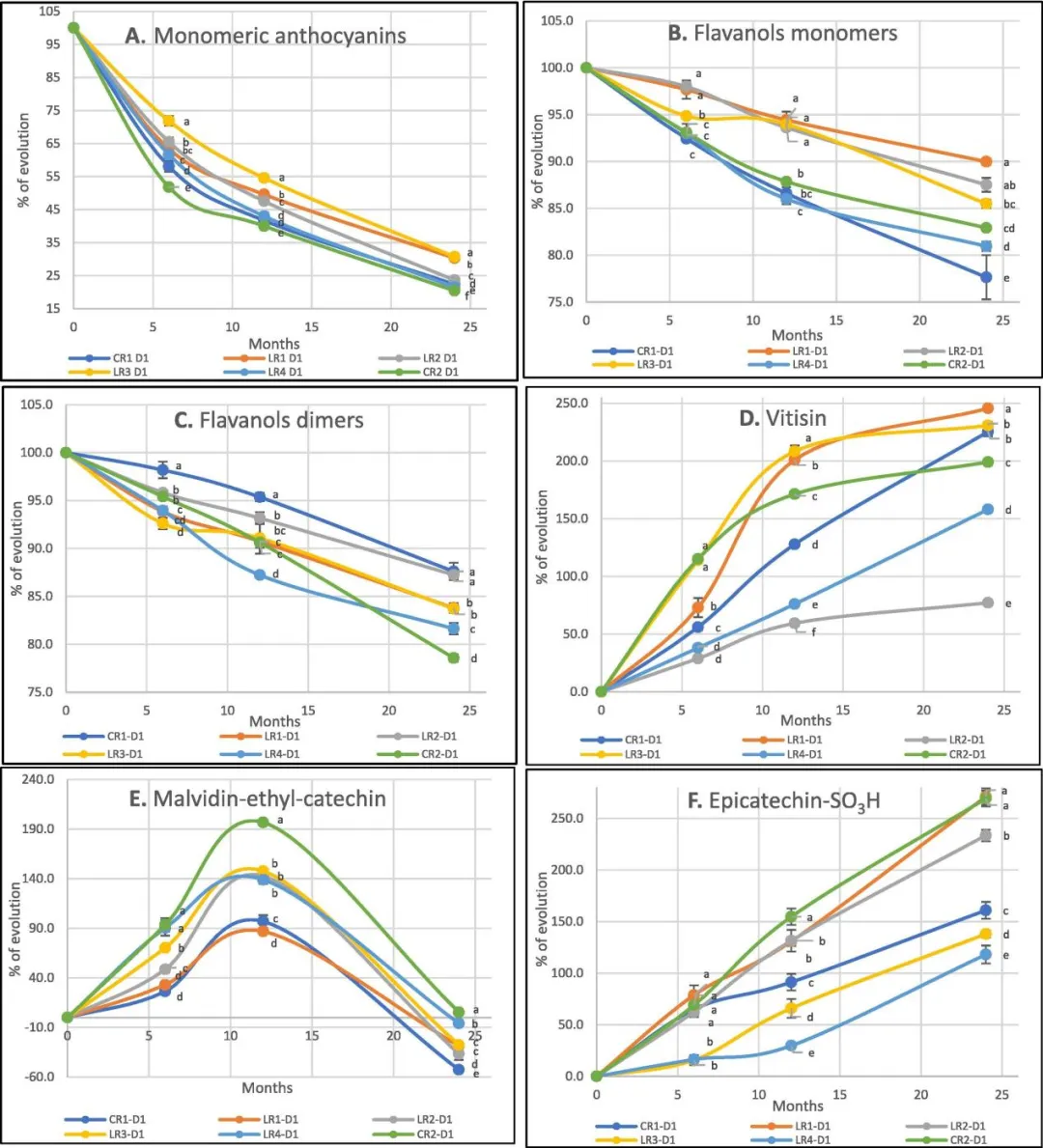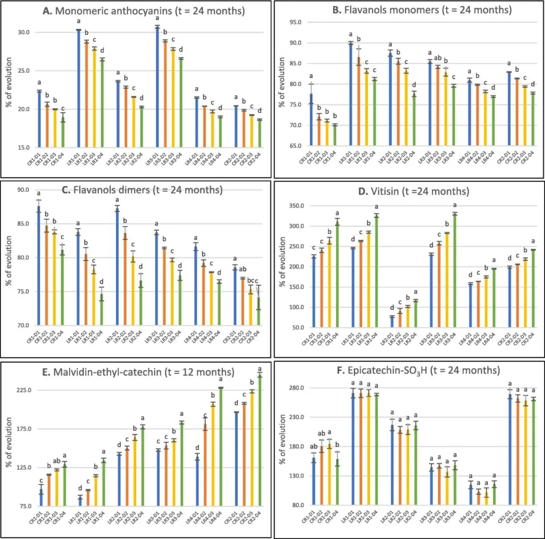这一观察结果与文献中报道的结果一致。LR4和CR2两款葡萄酒样本表现出相似的趋势。在给定的陈酿时间内,两种极端软木类型(D1 和 D4)之间的进化百分比(ΔE%)差异从CR2的1.8 %到LR3的4.1%不等。葡萄中天然存在的三种花青素都观察到了这种一致的趋势。事实上,OTR的上升促进了这些分子参与花青素和黄烷醇之间的氧活化反应,如吡喃花青素和乙基连接的色素形成。