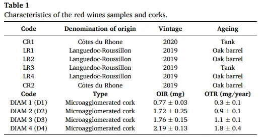 如上一节所述,目标多酚在24个月内的整体演变取决于所分析的分子和所研究的红葡萄酒的类型。然而,还必须考虑软木塞对这些曲线的影响,特别是对于归因于氧化机制的变化。葡萄酒使用四种具有不同OTR的微团聚软木塞装瓶,称为D1、D2、D3和D4,其各自的特性见表1。