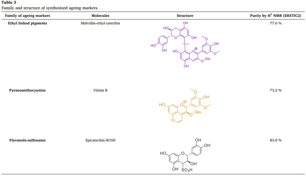根据先前的研究,选择了代表葡萄酒陈酿过程中形成的不同多酚家族的三个关键分子(表3)。这些分子是:
