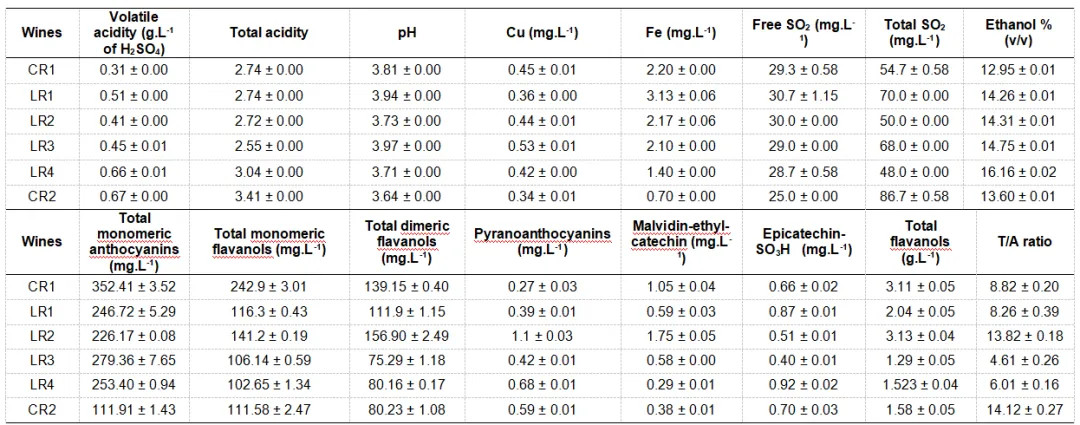装瓶后黄烷-3-醇单体的浓度在102.65至242.90 mg/L,对于最年轻的红葡萄酒(CR1)来说,浓度更高。黄烷-3-醇二聚体的浓度在75.29至156.90 mg/L之间。单体花青素的浓度范围为111.91至352.41 mg/L,花青素单糖苷占总单体花青素的比例在64.4%至72.3%之间。另一方面,它们的乙酰化和香豆酰化的浓度较低,锦葵素-3-葡萄糖苷衍生物是最丰富的单体花青素。此外,在最初的葡萄酒中,陈酿多酚标志物的浓度低于天然多酚的浓度。