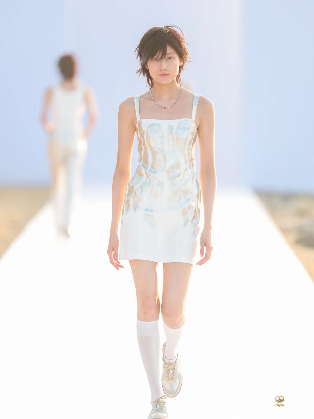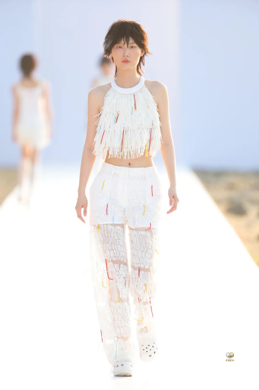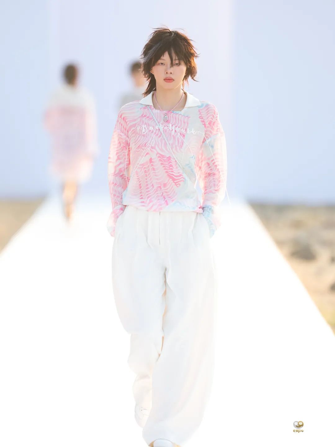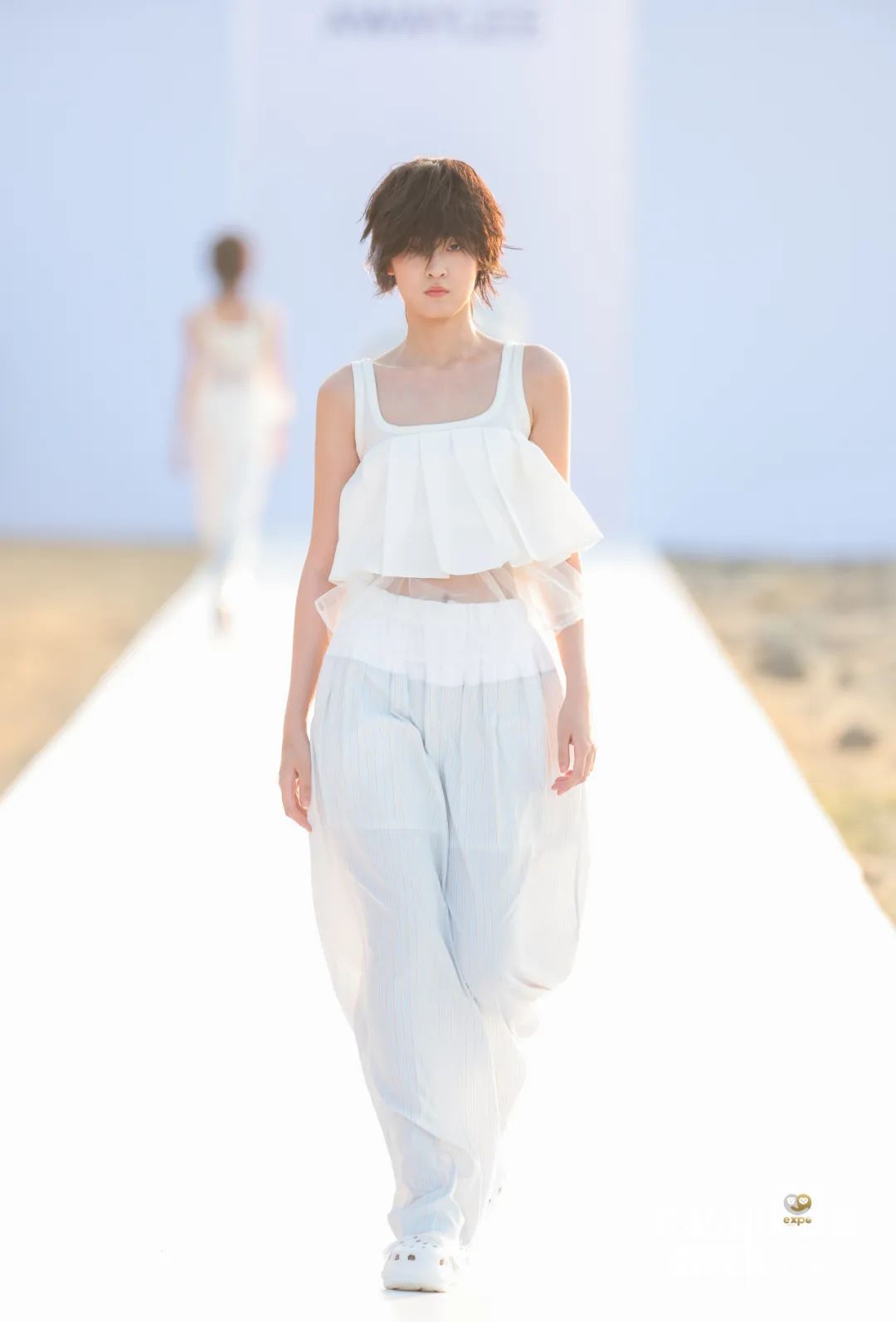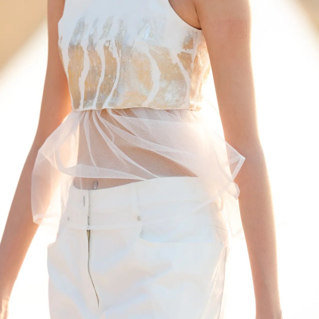 4月16日日落时分,中国设计师杨乐携中国设计师女装品牌AWAYLEE SS2024「Back Youth · 归来少年」系列亮相消博会时装周海滨秀场。突破身份、年龄和性别的边界,回归本真自我,是杨乐本季所表达的主题。从基础的背心、运动风上衣、到不对称设计衬衫裙、钉珠连衣裙,该系列单品秉承以人为本的实用主义精神,廓形干净利落,而流动的印花、绳绣和流苏装饰又为服饰带来少年感满满的灵动韵律。