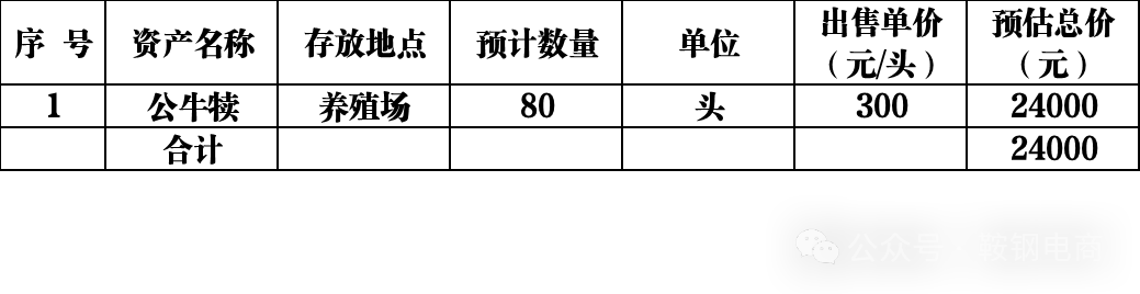 鞍钢实业集团乳业有限公司定于2024年4月24日在德邻循环平台(网址:http://xh.dllg56.com)进行公牛犊的网络竞价销售,现将具体事项公告如下:报名时间:公告日-2024年4月23日下午16:30时报名截止;竞买人如需看样,请提前与产权单位联系预约看样,竞买人自愿到实物现场查看实物情况,并办理相关签字和拍照等事宜。竞价时间:2024年4月24日10:00-11:001、参与竞价客户条件:本次竞价面向鞍钢电商平台注册的客户,新客户可通过电商平台自行注册,不明事项请联系平台客服,客服电话:400-9855-888(1)本次竞价的资源为出生3天之内的公牛犊。出生重30公斤以上(含30公斤)且健康,符合检疫相关要求;犊牛粪便的异常等其它一切因素不做为公牛犊健康评定标准。(2)数量及底价。预计80头, 大小不一不可挑选;预计量仅供参考,以实际量为准。起拍价300元/头(税率0%)。(3)饲养时间。公牛犊出生检疫后通知客户取牛,每头公牛犊饲养时间不超过72小时,超过72小时后取牛,每24小时收取50元,不足24小时也按24小时计算。(周末,节假日正常) (4)履约保证。签订合同前购买人要缴纳履约保证金,额度为预计成交总额的10%。(5)结算方式。现款现货,即每次实现销售时,购买人要全额支付货款。(6)提货方式。货物自提,购买人自行负责装车、运输。3、保证金:为保证竞价秩序,参与竞价客户需在竞价前向电商平台缴纳竞价保证金5000元。(交款日期:至2024年4月23日下午16:30时止),否则不允许参加竞价。竞价未成功客户的保证金自动释放,在7个工作日内给予退款;竞价成功客户按照成交总金额的0.8%服务费率缴纳交易服务费用,交易服务费用从竞价保证金中扣除;若保证金不足,客户需补交服务费差额。竞价成功客户可凭其与委托单位签订的合同和退款函向电商平台办理保证金余额的退款手续。4、销售价格为免税价格。买受人以银行存款转账方式支付,不收取承兑汇票。5、本批次资源为有底价连续竞价,竞价者在底价基础上进行增价竞价(提醒:在电子商务平台竞价时输入价格为竞价增价,不包含底价,竞价梯度视货值另定),竞价规定时间内最高价格客户竞价成功。此次竞价为延时竞价,延时竞价时间从常规竞价结束前3分钟内最后一次报价开始,单次延时时间为3分钟,以此循环类推,以最后截止时间的最高价结束竞价。6、合同履约:竞价成功客户请务必于接到通知起5个工作日内与鞍钢实业集团乳业有限公司签订合同。7、违约责任:发现恶意竞拍或者竞价成功后未及时签订合同并履行的情况,在核实具体情况后将根据电商平台规定将用户列入黑名单,并没收保证金。买卖双方如发生合同纠纷,协商不成的,任一方均有权向本合同签订地有管辖权的人民法院起诉。电商平台联系人:周诗杨 电话:0412-6726921、13019608962众元产业公司联系人:佟硕 电话:15140844229