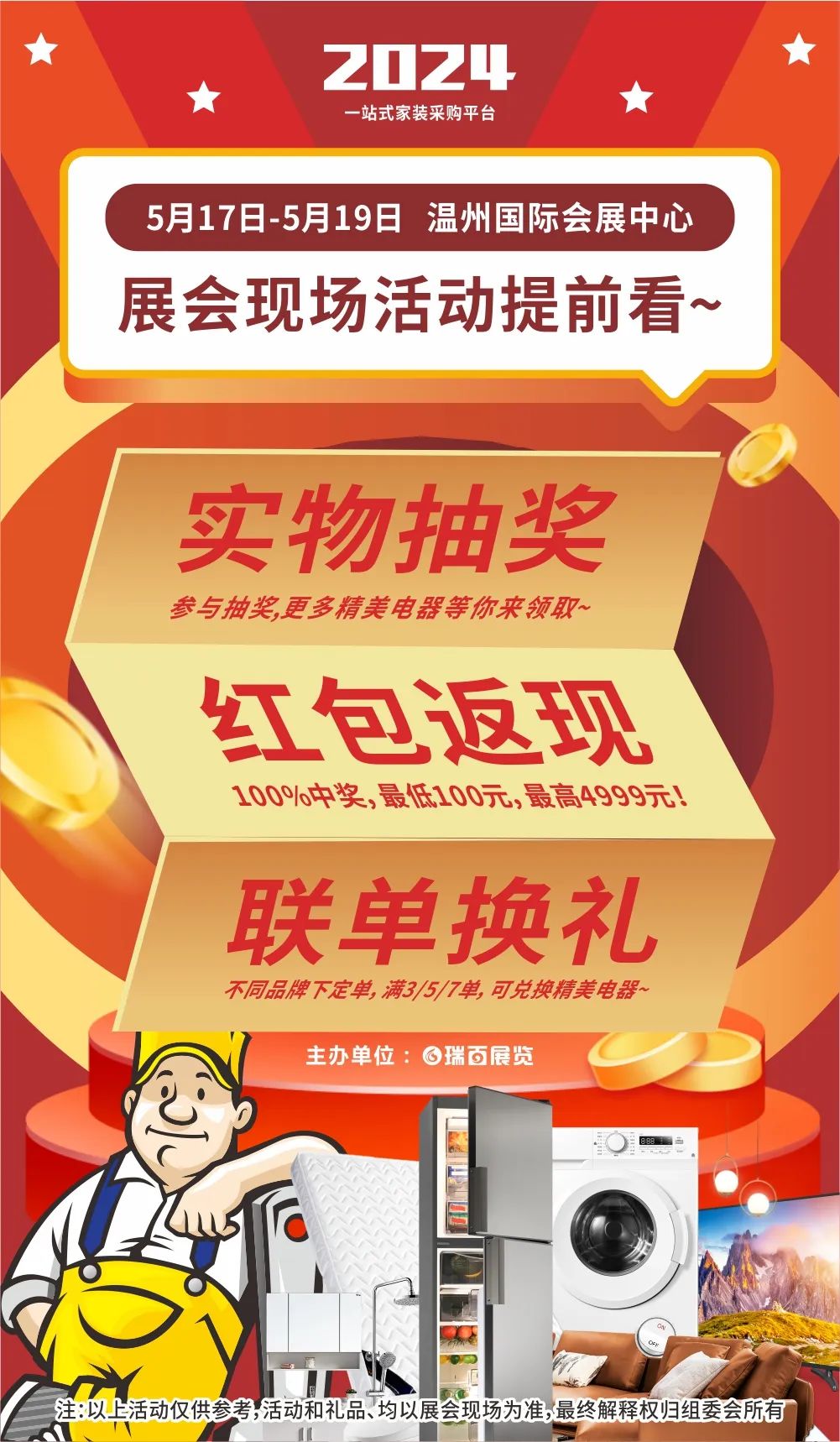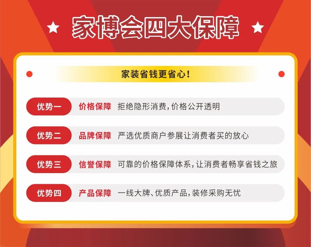 本次家博会的现场依然有红包返现、联单换礼、实物抽奖等多种主题活动等着各位业主,只要来到5月家博会现场下定单即可参与活动赢好礼!