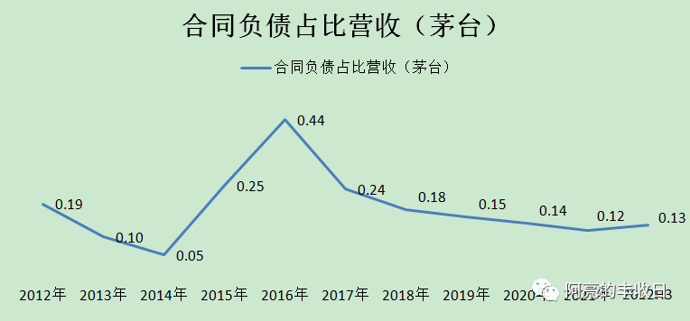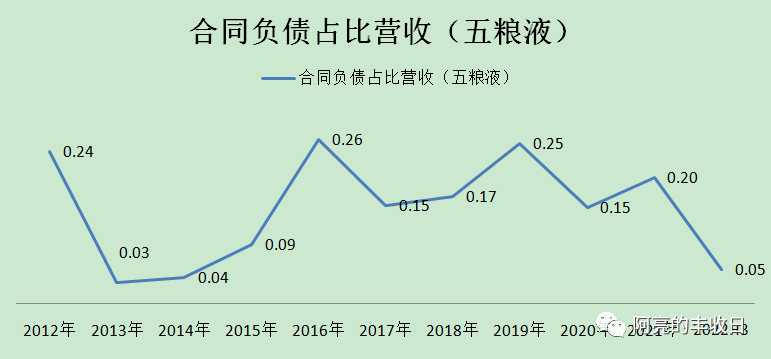 很显然,五粮液这二年的增速也不像以前那样的猛了。开始有下滑的情况。接着我们看下合同负债占比营收的情况,如下: