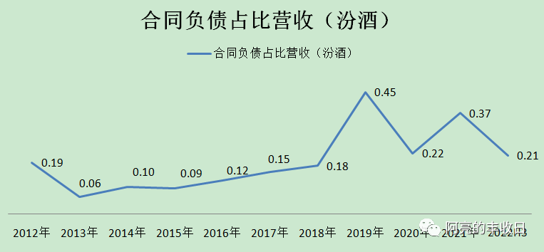 从增速上来看,洋河依然优秀。但管理上面确实不如近期的泸州老窖与汾酒。但管理上面我们看到洋河有出现好转的情况,接着我们看下洋河的合同负债占比情况,如下: