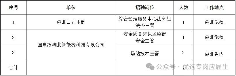 | 2 | 新能科技 公司 | 安全质量环保监察部 安全主管 | 1 | 1.负责组织安全环保法律法规与上级文件精神的学习传达,组织开展安全生产教育培训,建立健全公司安全管理档案。 2.负责建立健全安全生产保证、监督、支持体系,保证三大体系协同运转。 3.牵头组织实施安健环管理体系与安全生产标准化建设,完善安全环保管理制度。 4.负责组织实施安全监督计划,落实季节性检查、安全生产月、安全专项检查等相关要求。 5.负责应急管理,组织开展应急预案修订、演练与应急能力评估。 6.负责建立完善公司安全风险分级管控与隐患排查治理双重预防工作机制。 7.负责实施现场日常监督,重点做好安全生产重大事项以及危大工程的现场监督。 8.完成上级交办的其他工作。 | 1.大学本科及以上学历、电力工程相关专业,中级以上职称。 2.具有注册安全工程师证书。 3.具有5年及以上电力企业安全生产工作经验。 4.熟练掌握各项安全法律法规、标准及电力行业建设、生产运行知识。 5.年龄不超过35周岁; 6.条件特别优秀者可适当放宽条件。 | 武汉 |