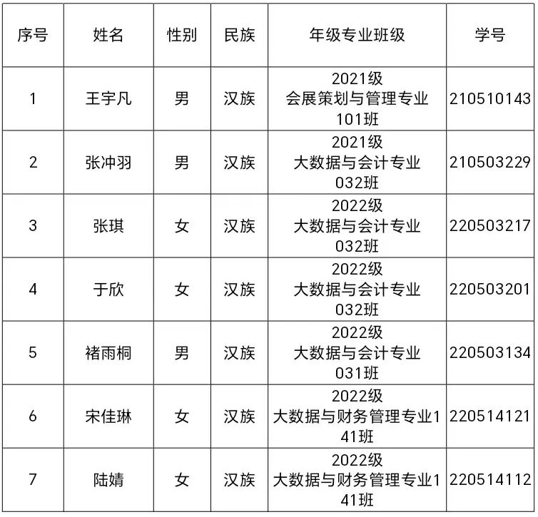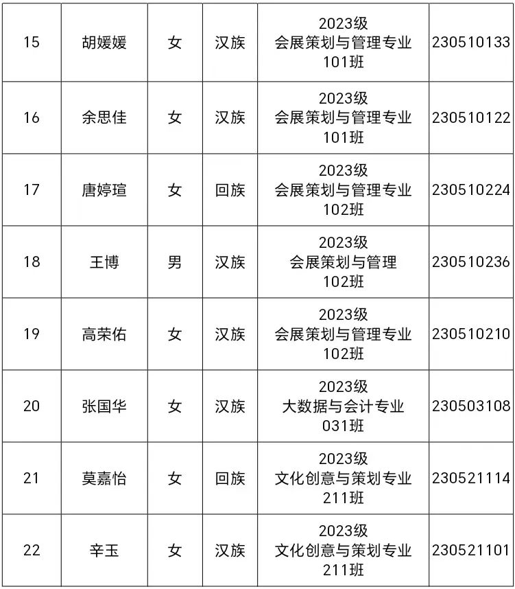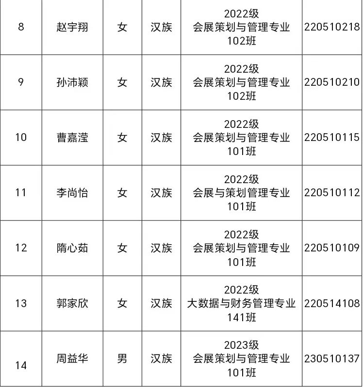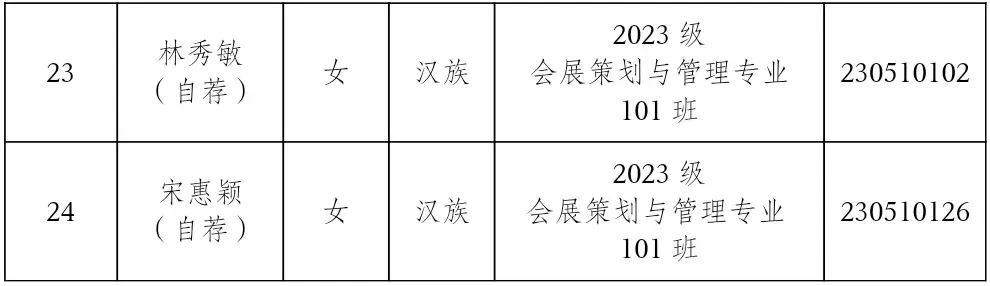 上海旅游高等专科学校第三十次学生代表大会拟于2024年6月5日召开。为充分发扬民主,体现广大同学意志,切实保障同学们的民主权利,确保本次学代会成为一次成功、务实的大会,使我校学生会在以后各项工作中发挥更大的作用,根据《上海旅游高等专科学校第三十次学生代表大会代表产生办法》,会展与经济管理学院组织推荐参与本次学代会的候选代表22名,现将名单公示如下: