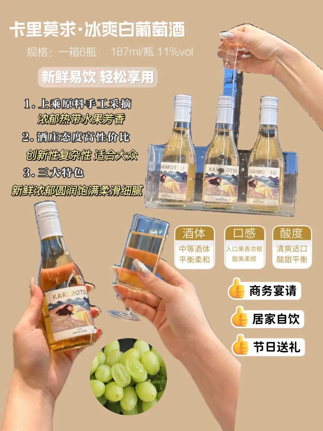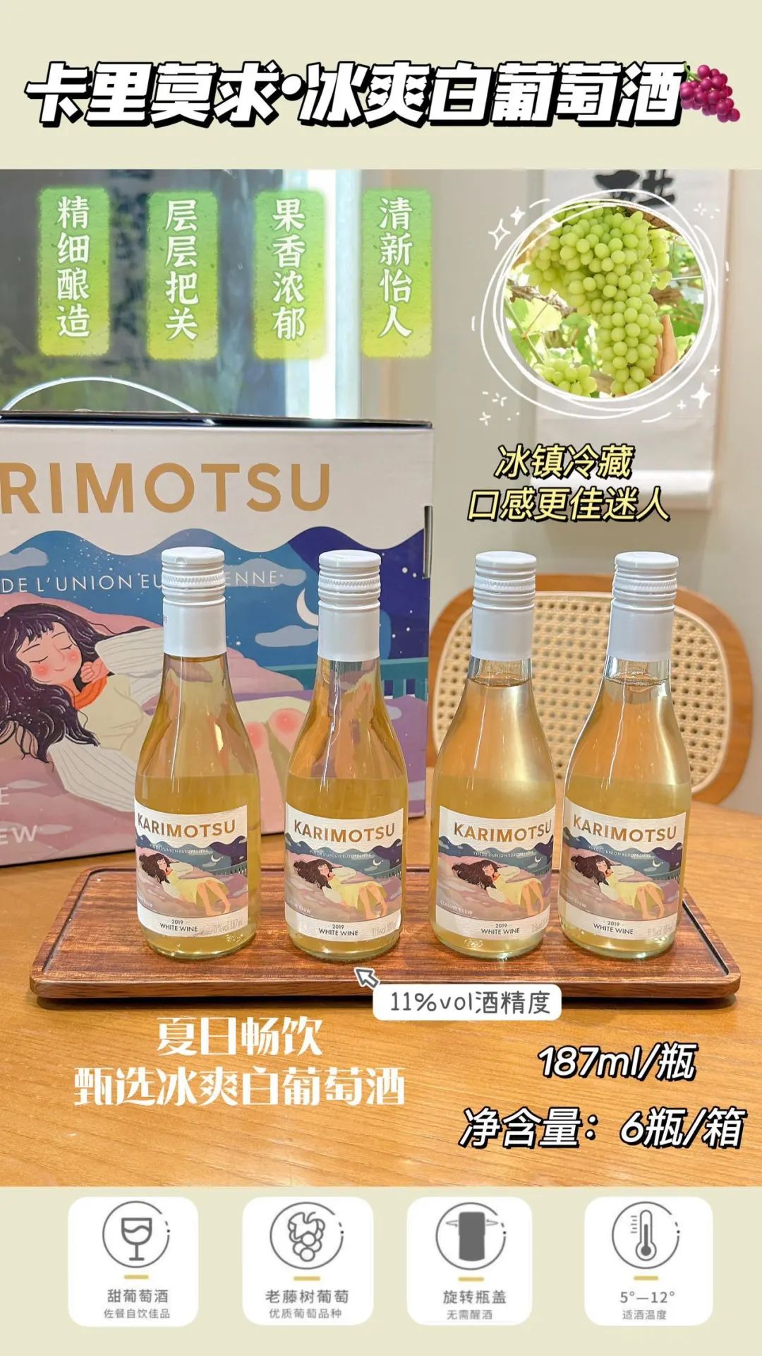 187ml/瓶装的容量,11%vol酒精度数适中,适合一人小酌或是三两小聚。