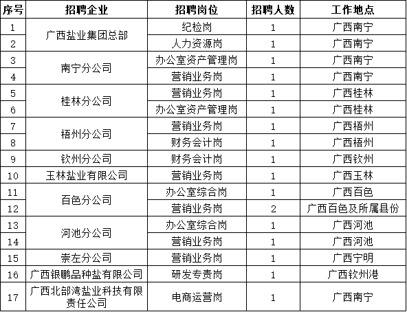 广西盐业集团有限公司为“世界500强”广西投资集团有限公司的二级子公司,是广西区内唯一荣获“省级食盐批发企业AAA级信用企业”的国有大型企业,具备省级食盐定点批发资质和食盐定点生产资质,为自治区人民政府本级食盐储备承储单位。公司注册资金11亿元。目前拥有分支公司31家,全资子公司5家,参(控)股企业6家,旗下的“桂山”“桂盐”牌食盐产品深受广西百姓的喜爱和信赖。广西盐业集团前身为成立于1962年的广西壮族自治区盐业公司。62年来,广西盐业忠实履行食盐专营企业的社会责任,在保障广西食盐供应和质量安全,维护盐业市场稳定,打击假盐私盐,消除碘缺乏病危害等工作中,广西盐业充分发挥食盐供应主渠道作用,保证了广西的食盐供应和社会稳定,实现了持续消除碘缺乏病危害目标。凭借60多年专业优质的服务和良好的经营业绩,公司多次荣获“广西优秀企业”“广西服务业企业50强”“自治区优秀企业”“广西五一劳动奖状”等荣誉称号。因业务发展需要,现公开招聘以下岗位人员,诚邀您的加入!