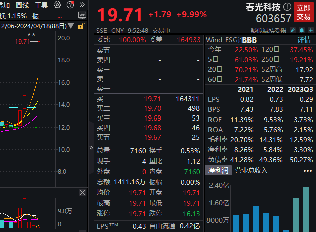 4月18日早盘,春光科技再度涨停,录得五连板,报19.71元,期间累计涨61%。