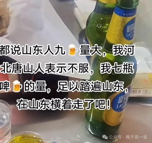 最近网上有一则关于唐山网友的视频在朋友圈里疯传,视频中的唐山网友拿着一瓶啤酒对镜头说:“我看啊,都说山东人的酒量有多厉害,可是我一点都不服气!”