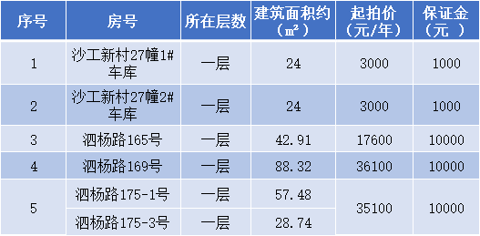 张家港市经开区(杨舍镇)沙工新村、泗杨路房产分5个标的拍租,租期3年。