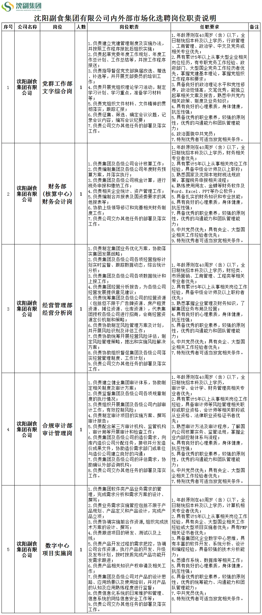 沈阳副食集团是沈阳市国资委出资的大型国有流通企业集团,是市管国有重要骨干企业之一,是沈阳市人民政府菜篮子工程的重要载体。为进一步加大人才公开选拔力度,拓宽选人、用人渠道,根据工作需要,面向集团内外部市场化选聘企业人才。