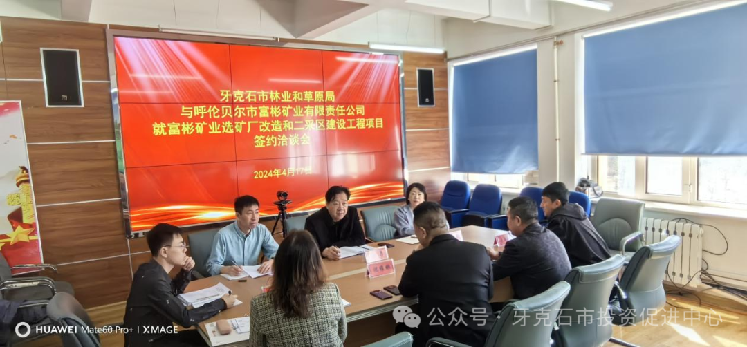 2024年4月17日,牙克石市林业和草原局组织召开招商引资洽谈会,与呼伦贝尔市富彬矿业有限责任公司一行就富彬矿业选矿厂改造和二采区建设工程项目深入洽谈交流。