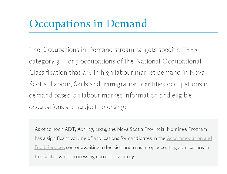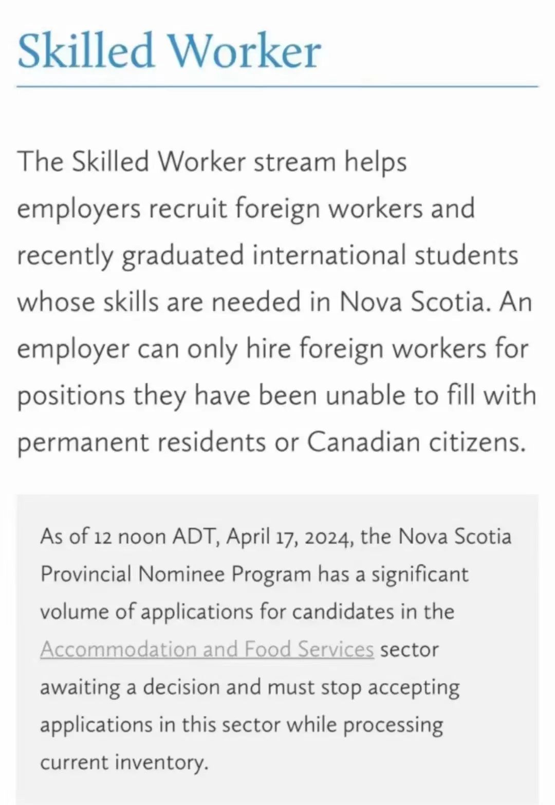 加拿大NS省宣布暂停接受国际技术工人通道,EE通道,OID通道的酒店和餐饮行业的省提名申请,优先处理积压案子。