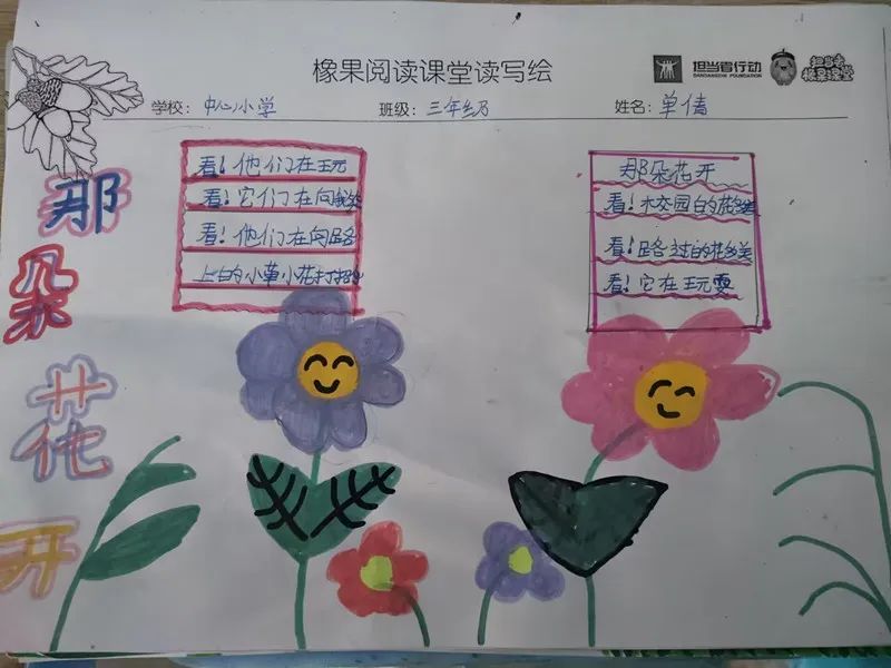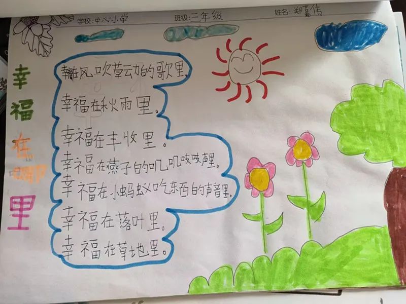 看一条河、听一座山,闻一朵花,那些自然赐予我们的幸福,来得简单又透明,纯粹又自然,就像橡果阅读在孩子们心底开出了花,又把他们变成一个一个小诗人。他们按照《幸福在哪里》作出了精彩的同题诗: