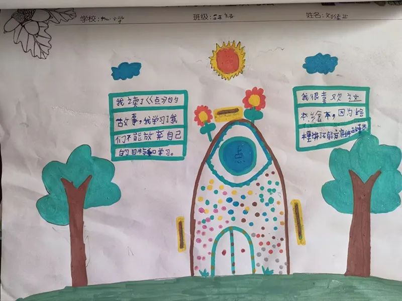 每一节橡果课堂上,随着故事情节的发展都有暂停环节,在这一两分钟的暂停环节,我会结合孩子们的生活实际以及平时遇到的问题让他们去思考,去表达,把自己融进故事,让故事的寓意为自己所用。孩子通过学习建立自己独特的观点,即使是一两句话的发言,我也会给予孩子们及时的鼓励和肯定。当然他们也会用自己的方式来填补语言空缺的地方,那就是“读写绘”,每堂课结束后孩子们都会用画笔来表达,描述他们的所思所想,所感所悟,或一首小诗,或一朵小花,或一片绿地,或一行简单的话语,我想无论哪一种方式,只要是在表达,就证明我们的阅读是有意义、有效果的,也说明阅读在孩子们心中有着美好的地位,这应该就是橡果课堂最好的魅力!