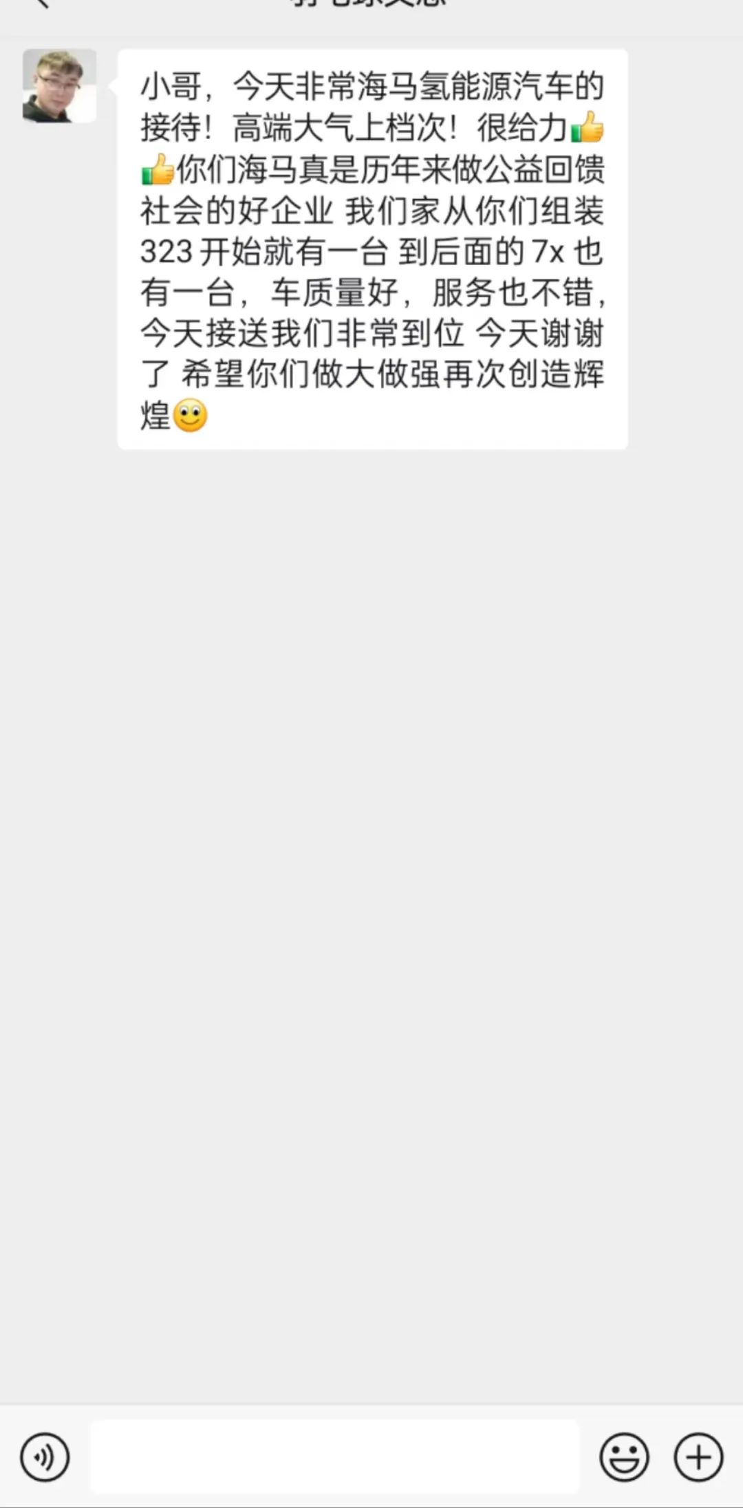 接四海来客,送八方贵宾。海马氢能服务团队在消博会期间的免费接送获得了观众们的一致好评,纷纷为海马氢能汽车点赞,同时还分享给了自己的亲朋好友,希望大家有机会可以多多体验海马氢能汽车的服务。
