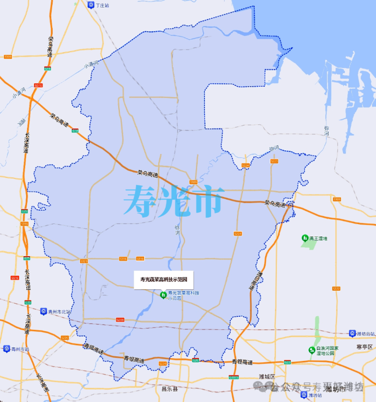 寿光境内有青银高速、荣乌高速两条高速路穿境而过,荣乌高速有寿光东、寿光北和寿光西出入口,青银高速有寿光、青州东(寿光)、昌乐(寿光)等出入口。