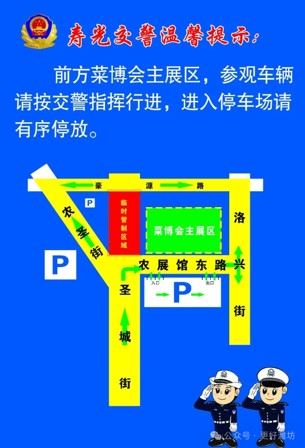 本地市民及驾驶员朋友发现外地游客时,可根据交通提示牌主动热情引导,或告知执勤交警引领游客至菜博会展区,文明有序、规范停车,充分展示我市市民良好的精神文明素质。