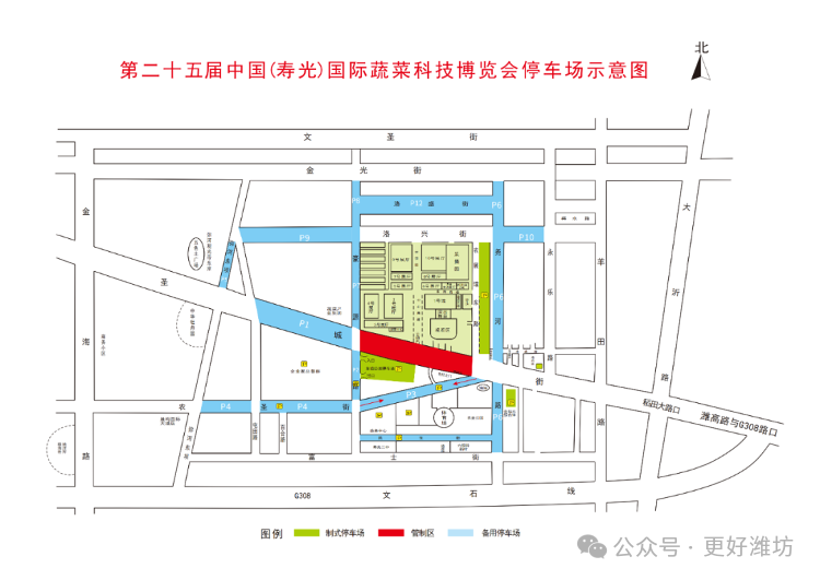 展会期间,寿光市在农展馆东侧、高科技示范园东、东城公园、体育场西侧、洛城全福元综合体设置了5个制式停车场;在圣城街(金海路与豪源路段)、农圣街(圣城街至晨鸣国际大酒店路段)、豪源路、尧河路、洛兴街、洛盛街等处设置了10个备用停车场;增设了圣城街洛中停车场(此停车场为临时停车场,仅限节假日期间停放车辆)、悦湖公园停车摆渡点、圣城街洛城全福元综合体北停车场,安排公交车对到菜博会参观人员免费摆渡。