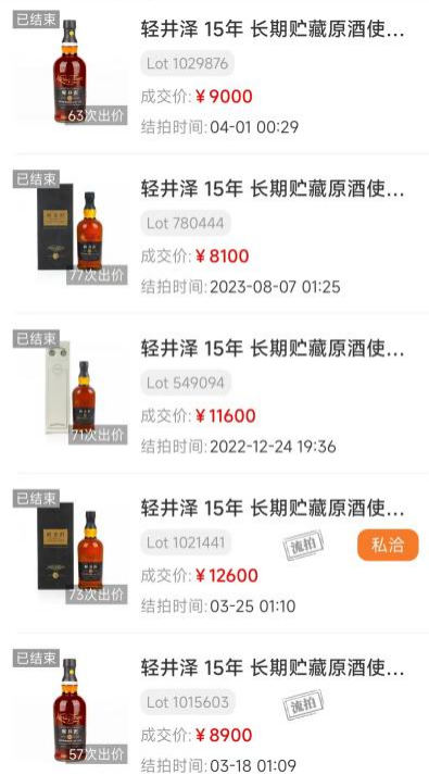 此瓶轻井泽15年是在Mercian公司经营时期装瓶发售,大约2000年酒厂停产前推出的酒款,基于酒龄31年(1969年蒸馏)到15年的原酒调配,长期于雪莉桶熟成。酒蟲网3月份成交价为¥9000,在该系列无盒拍品之中属于中高段价位(有盒版在万元以上),恭喜拍主获得轻井泽坚挺硬通货。