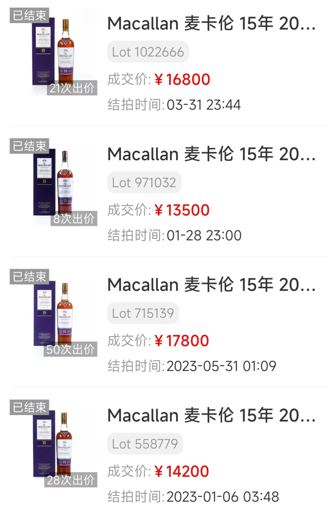 麦卡伦非常经典的15年Gran Reserva,于2017年限量发布。采用初填雪莉桶熟成,色泽深邃迷人。从去年初至今,虽然偶有起伏,整体表现可称稳定(如上图)。今年3月底以¥16800成交,不仅是个“好意头”,更是离去年巅峰期¥17800只有咫尺之遥。