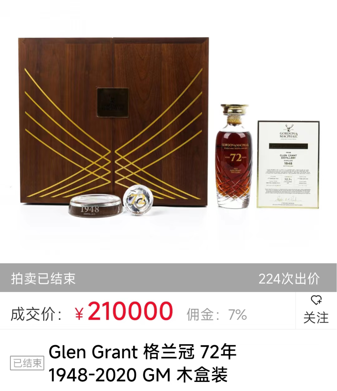 大名鼎鼎的格兰冠72年1948,由GM公司隆重出品。翻阅欧洲拍卖网站,这款现象级美酒曾于2022年底在whiskyauctioneer以23000英镑成交;酒蟲网3月份专场,此酒落槌价达到¥210000,创造了数月以来又一座新高峰。红润色泽带来了融融暖意,绝对是市场浪涛之中的定海神针。