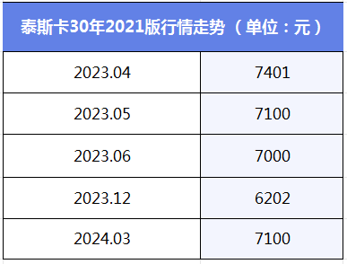 以泰斯卡30年2021在酒蟲网大拍走势为例,如下方图表,该酒去年4月份的价位为¥7401,随后从5月份开始下跌,到年底跌至最低谷¥6202;所幸在今年3月份止住了下滑势头,没有跌破¥6000关口,而是一个强劲反弹,上涨至¥7100,与去年5月份持平。