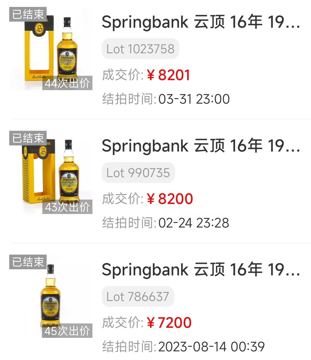 Springbank 16年2016本地大麦,采用琴泰半岛Low Machrimore农场的春麦Prisma酿制而成,其中调配有80%波本桶原酒和20%雪莉桶原酒。酒蟲网3月底以¥8201成交,虽比2022年巅峰期的万元价位有所回落,却也挽回了去年的颓势,逐渐从谷底企稳回暖。
