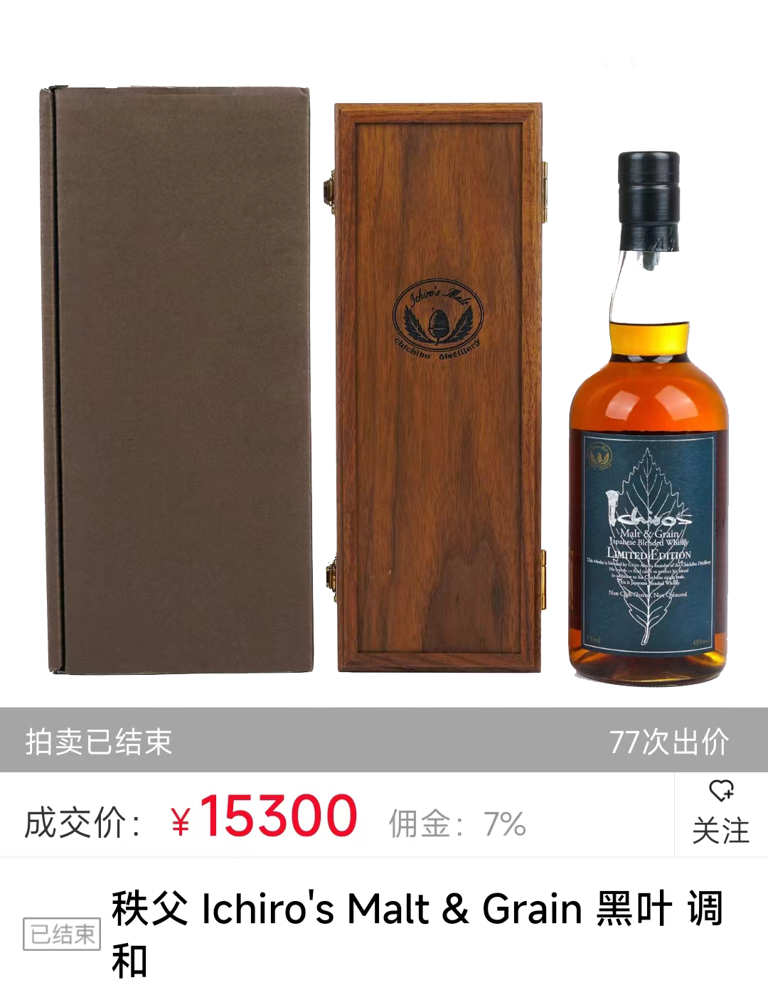 此款美酒是秩父“麦芽和谷物调味威士忌”系列中的顶配款Limited Edition,选用秩父、羽生、川崎三家原酒,由伊知郎亲自调配而成。酒蟲网第206期以¥15300落搥,不仅比同系列普通款的价位高出数千元,更是无比接近于2022年巅峰期的¥15600,非常值得藏家们持续关注。