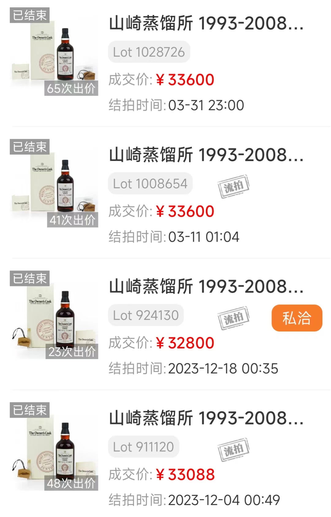 Suntory经典的业主私藏系列,1993年蒸馏,在雪莉桶中陈酿,2008年灌装。单桶酒精度高达62%vol,酒体深邃迷人,限量仅发布468瓶。该酒命途多舛,连续多期沦为流拍。所幸今年3月以¥33600成功拍出,且创造了数月以来的最高价。山崎雪莉业主桶老酒,值得耐心期许。