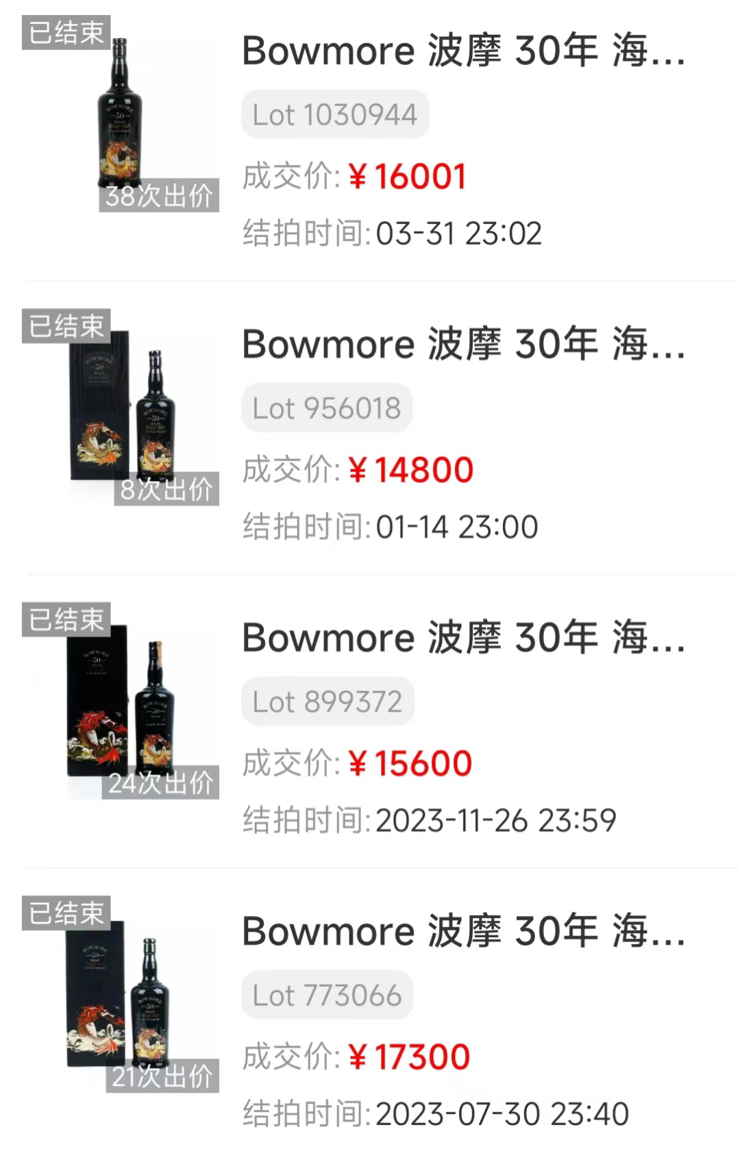 波摩这款30年“海龙王”瓶子里面装的是酒厂在1960年代蒸馏的古老原酒,包装设计古色古香,获评Whiskyfun五星级+90分赞誉。今年3月底成交价为¥16001,与2023年¥14000-¥17300的价位区间基本相符。对比去年11月至今有逐渐回升的势头,经典好酒隽永流传。