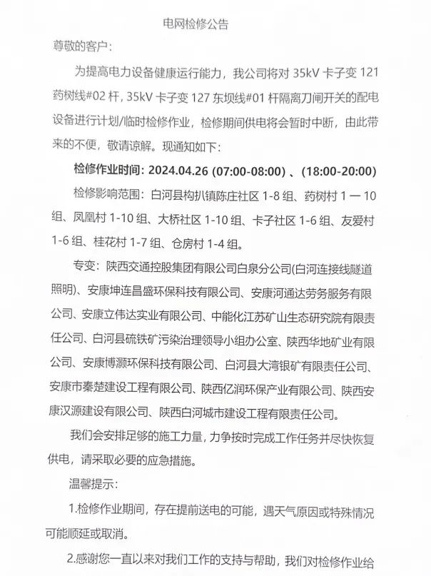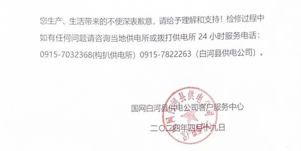 2.感谢您一直以来对我们工作的支持与帮助,我们对检修作业给您生产、生活带来的不便深表歉意,请给予理解和支持!检修过程中如有任何问题请咨询当地供电所或拨打供电所24小时服务电话:0915-7032368(构扒供电所)0915-7822263(白河县供电公司)。