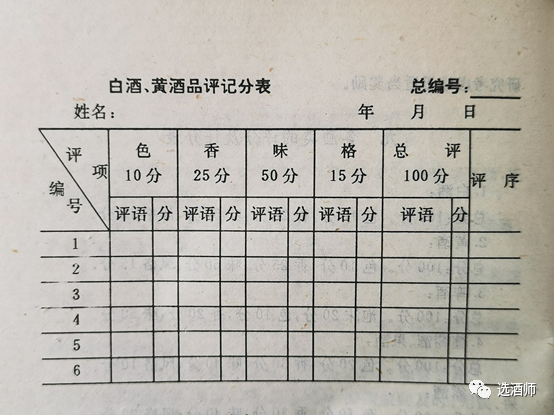 从1979年第三届全国品酒会以来使用的白酒品评记分表,已经有40多年了。这个打分表分为四项,其中色10分,香25分,味50分,格15分。