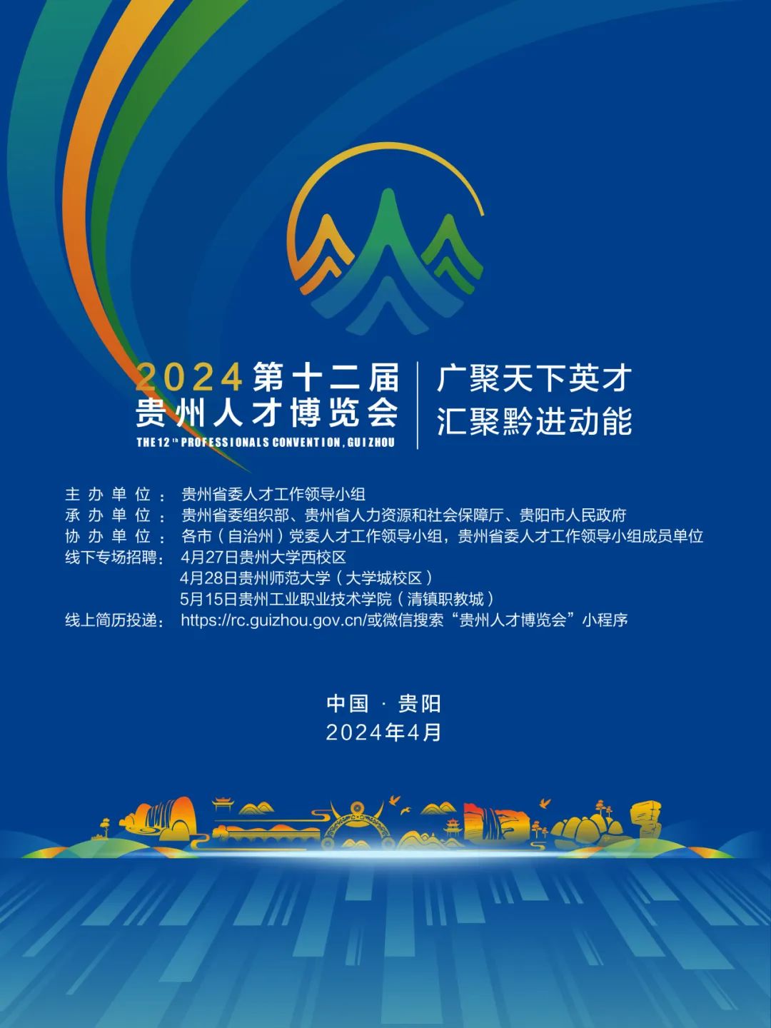 贵州人才博览会(简称“人博会”),是贵州省委人才工作领导小组主办,中共贵州省委组织部、贵州省人力资源和社会保障厅、贵阳市人民政府承办的省级人才交流活动。大会举办期间,集中举办人才发展研讨会、人才集中公开招聘、人才工作集中展示、人才发展政策宣传等活动。邀请国家有关部委、知名高校、有关协会负责人,国内外知名专家、学者、科研人员,海内外高层次人才、国内外创新创业团队、创新创业项目代表作为嘉宾参与活动。从2013年起,已连续举办十一届,今年第十二届贵州人才博览会于2024年4月27日—28日举办。